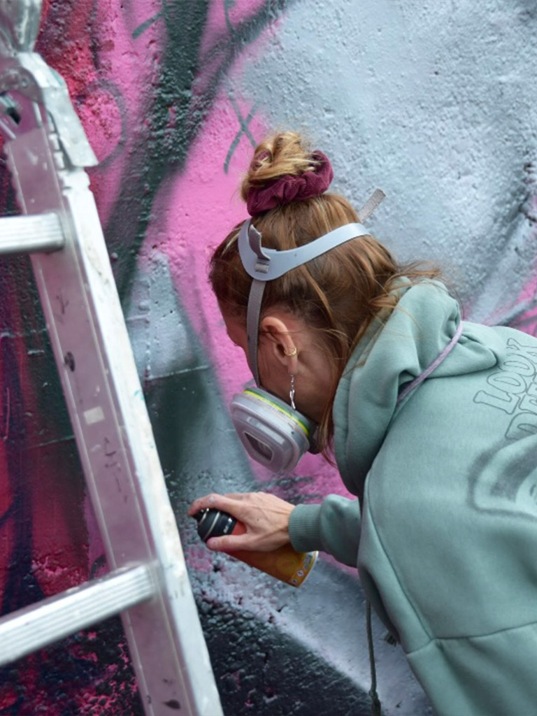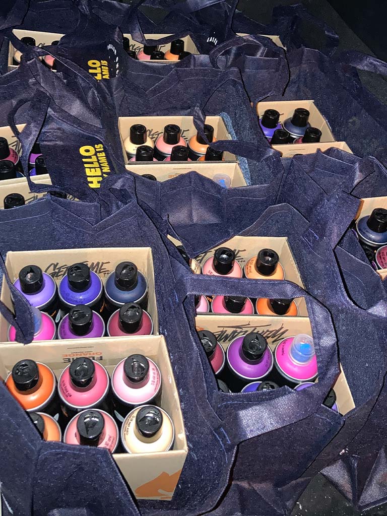 Pour les aérosols, afin d’accorder nos productions, nous avons composé un set de 12 couleurs dans la gamme Flame Orange de notre dealer de couleurs favoris, Urban Painters qui avec la Ligue ont participé en sponsorisant les artistes participants à notre action.